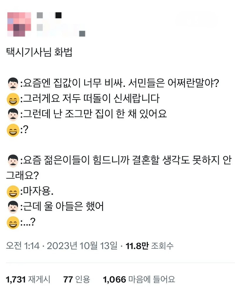 묘하게 킹받는 택시기사님 화법 특.JPG 칠성그룹 0 296 0 3시간전 link URL 복사: https://humorpick.com/bbs/board.php?bo_table=humor&wr_id=402619 컬투쇼 톤으로 상상하니 재밌네 0