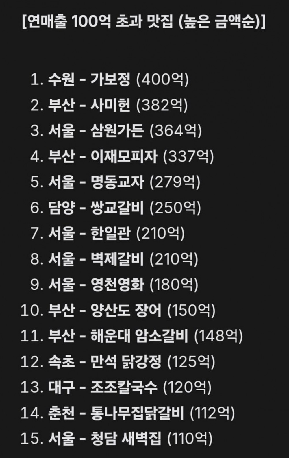 그 유명한 수원갈비의 위엄 소밀면 0 262 0 2시간전 link URL 복사: https://humorpick.com/bbs/board.php?bo_table=humor&wr_id=403320 전국 음식점 매출 1위 가보정 0