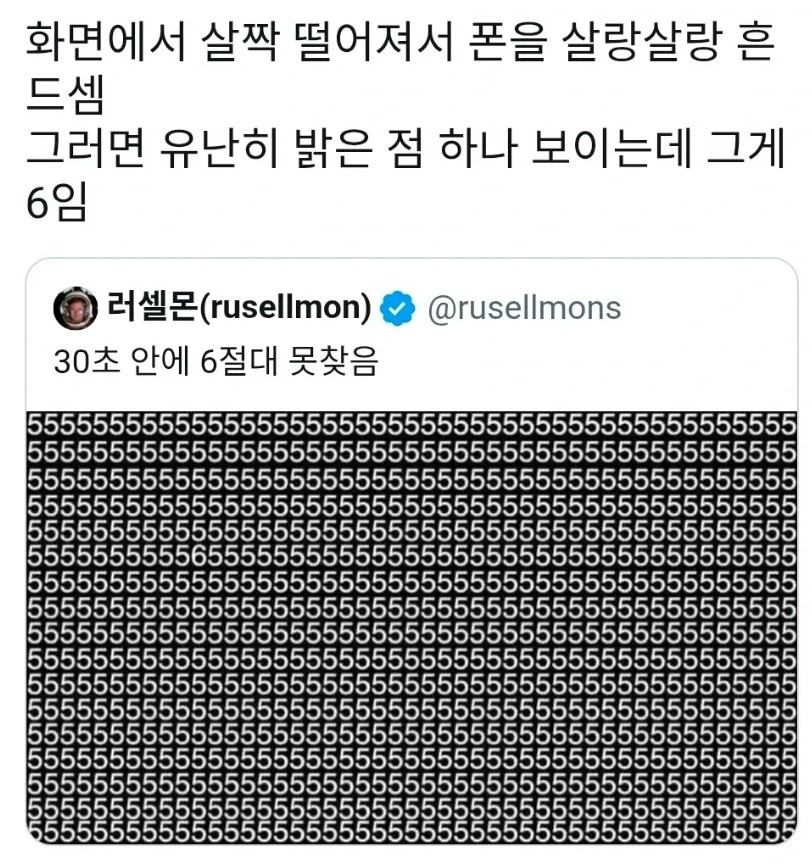 30초안에 6 절대 못 찾는다고? Pixel 0 303 0 4시간전 link URL 복사: https://humorpick.com/bbs/board.php?bo_table=humor&wr_id=403468 0