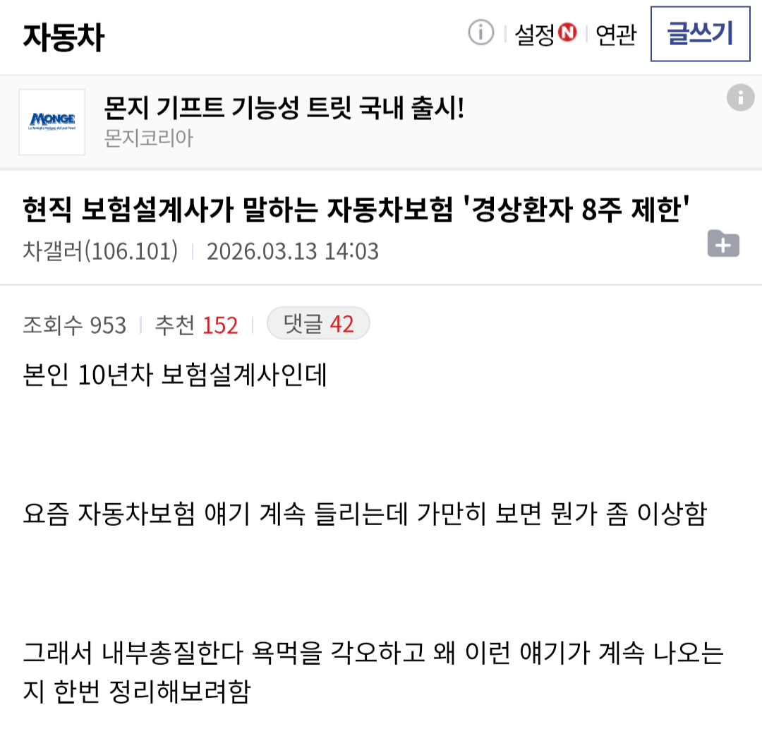 보험설계사가 말하는 자동차보험 '경상환자 8주 제한' 픽시베이 0 259 0 2시간전 link URL 복사: https://humorpick.com/bbs/board.php?bo_table=humor&wr_id=405209 0