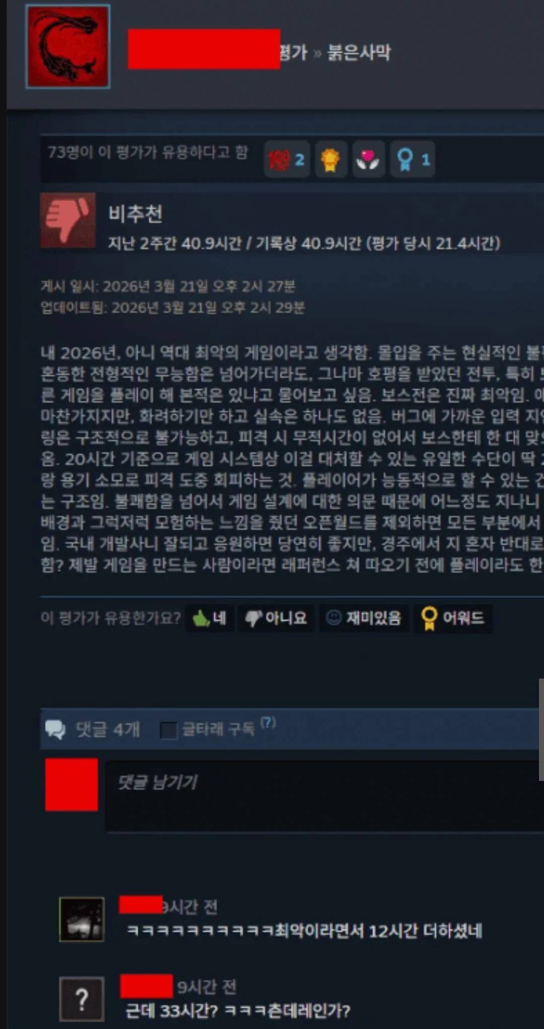 붉은 사막은 2026년, 아니 역대 최악의 게임이다 라카라카 0 253 0 1시간전 link URL 복사: https://humorpick.com/bbs/board.php?bo_table=humor&wr_id=406018 "붉은 사막은 2026년, 아니 역대 최악의 게임이다." (라는 리뷰를 쓰고나서 20시간 더함) 저분 현재 3일차 41시간 플레이.... 0