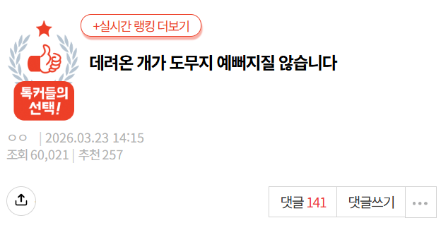 [네이트판] 데려온 개가 도무지 예뻐지질 않습니다 픽시베이 0 261 0 03.26 23:34 link URL 복사: https://humorpick.com/bbs/board.php?bo_table=humor&wr_id=406167 출처:http://zul.im/0P7dM1 + 강아지 사진 추가하셨는데 너무 관리 잘 해주시는게 보임? 0