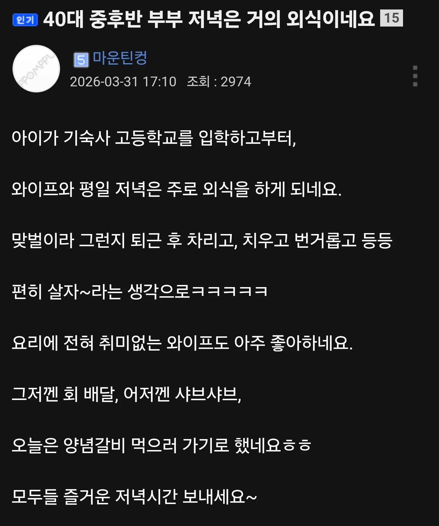 40대 중후반 부부 저녁은 거의 외식이네요 김밤비 0 245 0 4시간전 link URL 복사: https://humorpick.com/bbs/board.php?bo_table=humor&wr_id=406641 0