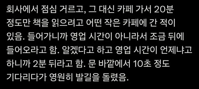 영업시간 2분 뒤라고 안내해서 가게 손절한 손님 아기물티슈 0 372 0 2시간전 link URL 복사: https://humorpick.com/bbs/board.php?bo_table=humor&wr_id=407091 0