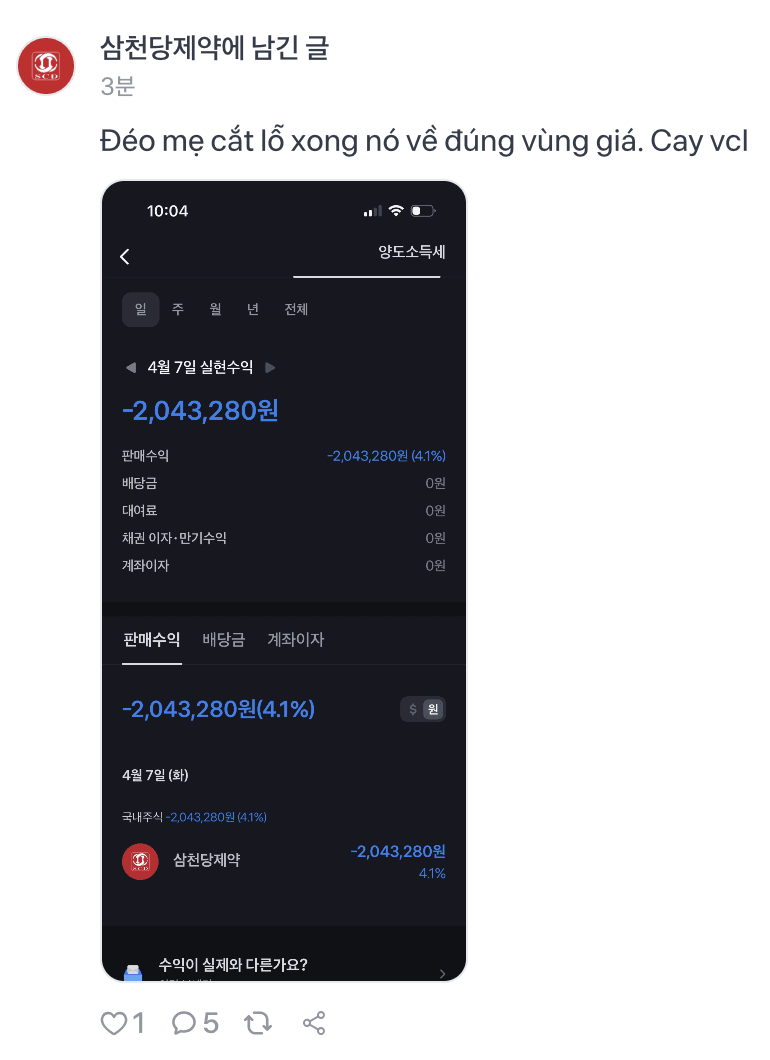 삼천당에서 단타치다 돈날린 베트남인 아라셀리 0 281 0 4시간전 link URL 복사: https://humorpick.com/bbs/board.php?bo_table=humor&wr_id=407145 번역 : 손절하니까 바로 본전 오네. 아, 씨X 진짜 열받네. 0