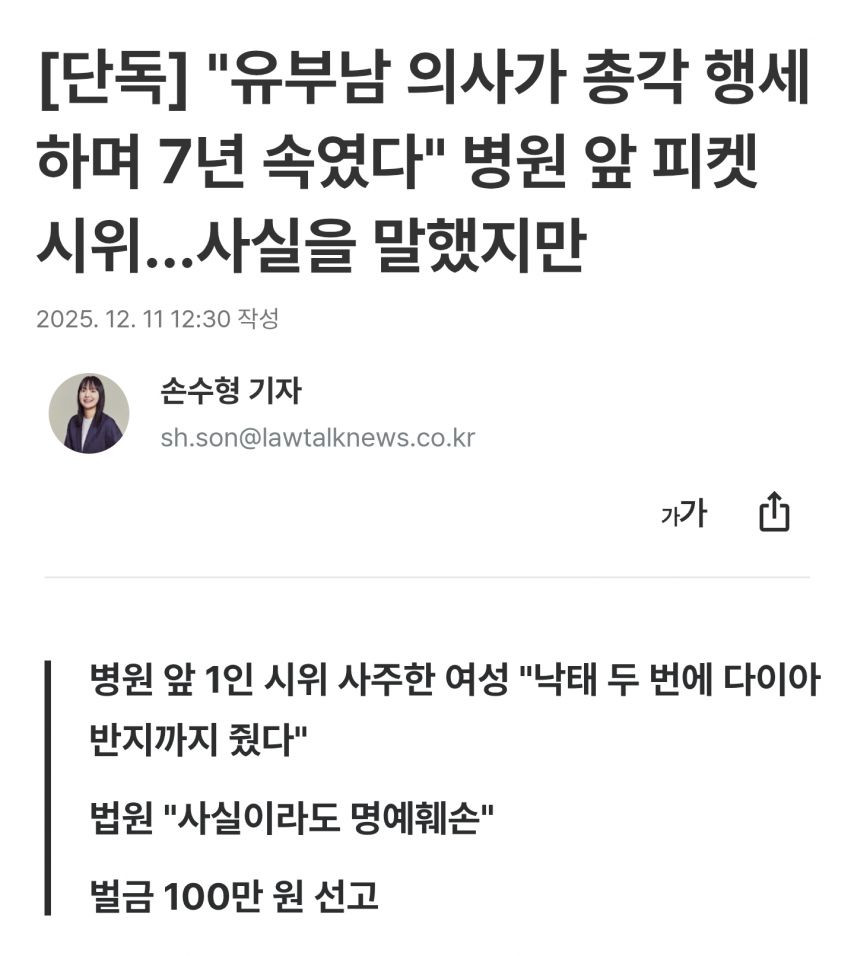 유부남 의사가 총각 행세하며 7년 속였다. 라이츄 0 121 0 12.15 15:17 link URL 복사: https://humorpick.com/bbs/board.php?bo_table=humor&wr_id=397328 https://lawtalknews.co.kr/article/IODBOHQSQ2KL사실적시 명예훼손으로 오히려 벌금 0