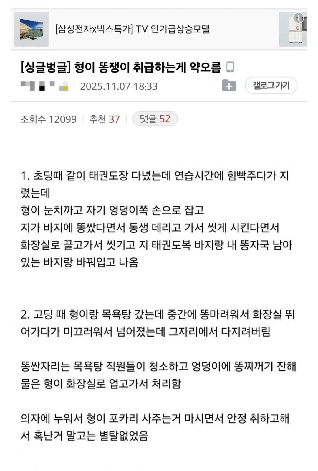 자기 형에게 똥쟁이 취급 당하는 남동생 소밀면 0 279 0 03.09 15:51 link URL 복사: https://humorpick.com/bbs/board.php?bo_table=humor&wr_id=404710 0