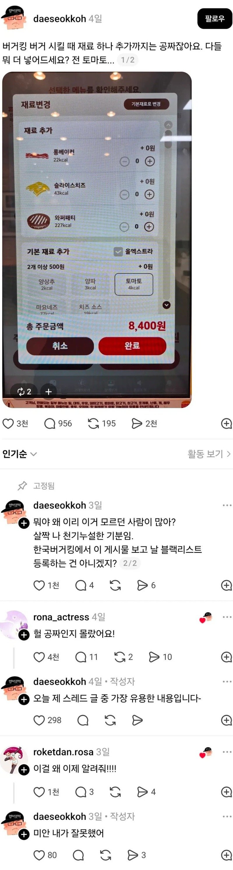 의외로 많은 사람들이 모르는 듯한 버거킹 팁 몽둥이 0 287 0 03.09 06:51 link URL 복사: https://humorpick.com/bbs/board.php?bo_table=humor&wr_id=404674 0