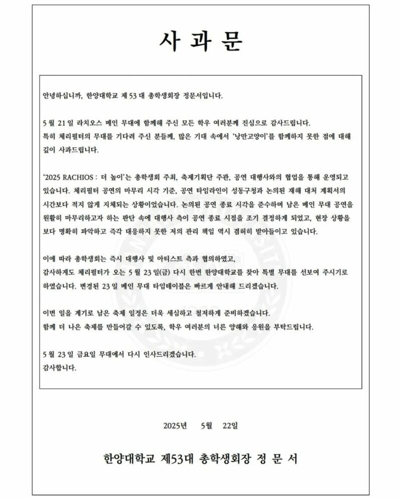 어제 한양대 축제에서 분위기 제대로 박살난 사건 우라칸 0 628 0 05.23 10:24 link URL 복사: https://humorpick.com/bbs/board.php?bo_table=humor&wr_id=381989 주최측에서 시간관리 문제로 앵콜곡으로 준비했던무려 낭만고양이를 자름순식간에 분위기 급다운학생회는 사과문까지 쓰고 금요일날 다시 오기로함 0