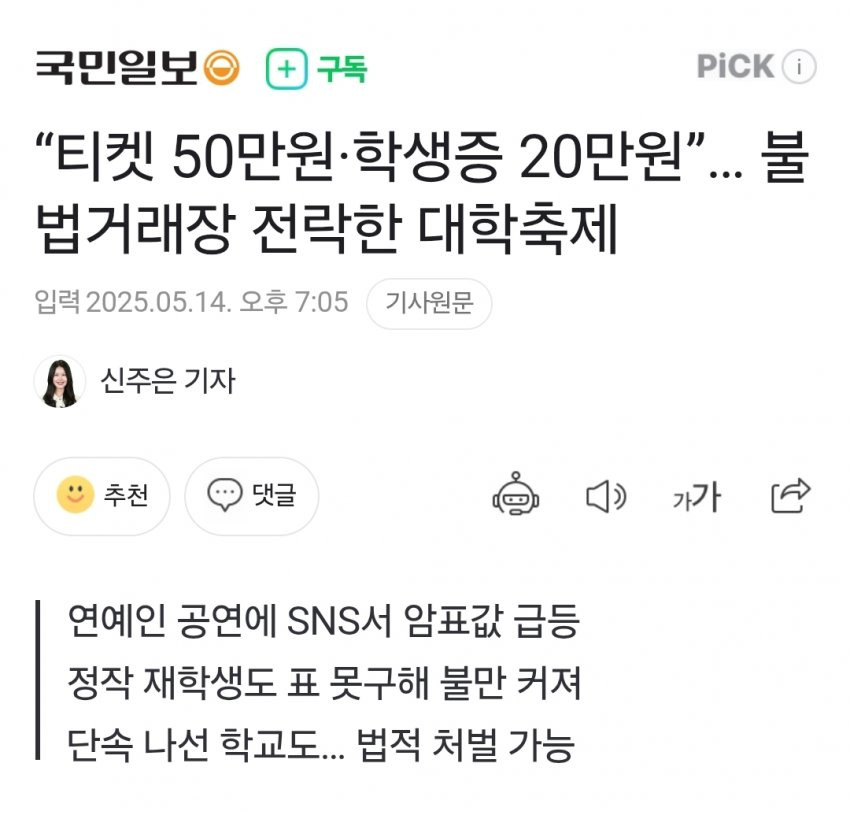 “티켓 50만원·학생증 20만원”… 불법거래장 전락한 대학축제 몽둥이 0 834 0 05.20 02:17 link URL 복사: https://humorpick.com/bbs/board.php?bo_table=humor&wr_id=381655 https://n.news.naver.com/mnews/article/005/0001776279 0