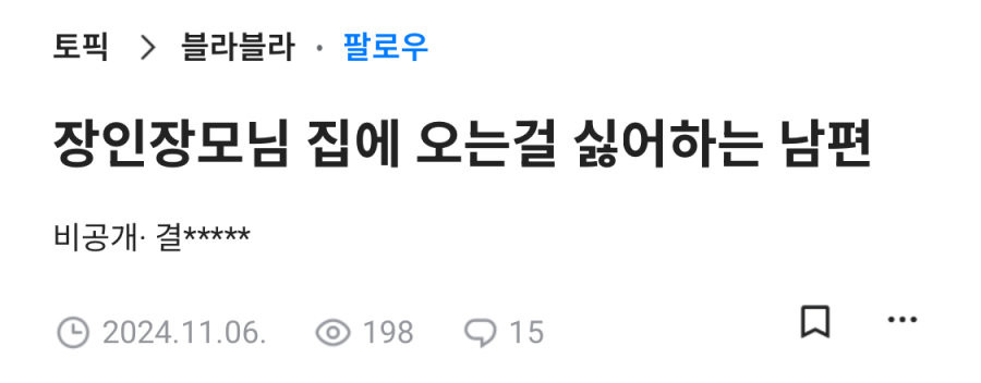 남편이 장인 장모님 오는 걸 싫어해 김밤비 0 1148 0 05.17 17:17 link URL 복사: https://humorpick.com/bbs/board.php?bo_table=humor&wr_id=381469 누가 예민한가요? 0