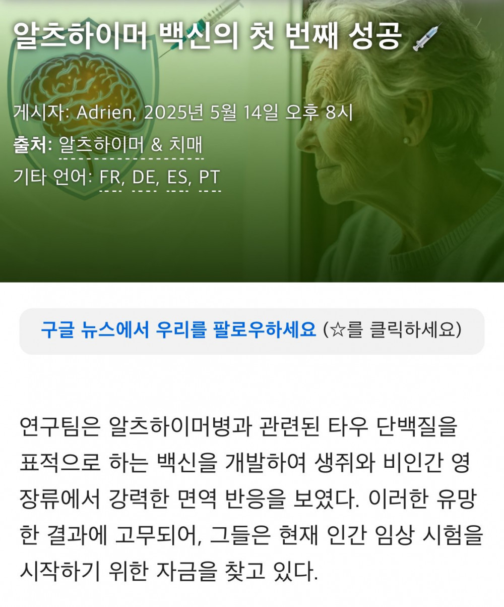 '알츠하이머' 치매 백신 연구 첫단계 성공 소밀면 0 936 0 05.16 10:48 link URL 복사: https://humorpick.com/bbs/board.php?bo_table=humor&wr_id=381086 동물실험 해보니 유망하다고 함 임상예정 0