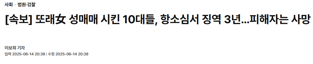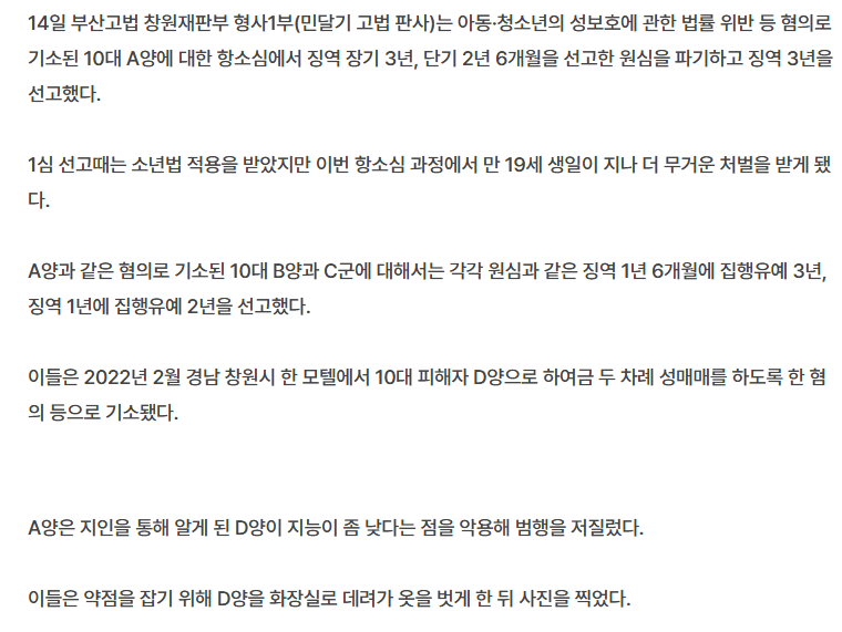 또래女 성매매 시킨 10대들, 항소심서 징역 3년…피해자는 사망 칠성그룹 0 706 0 06.16 04:51 link URL 복사: https://humorpick.com/bbs/board.php?bo_table=humor&wr_id=384239 https://www.seoul.co.kr/news/society/law/2025/06/14/20250614500035?wlog_tag3=naver 0