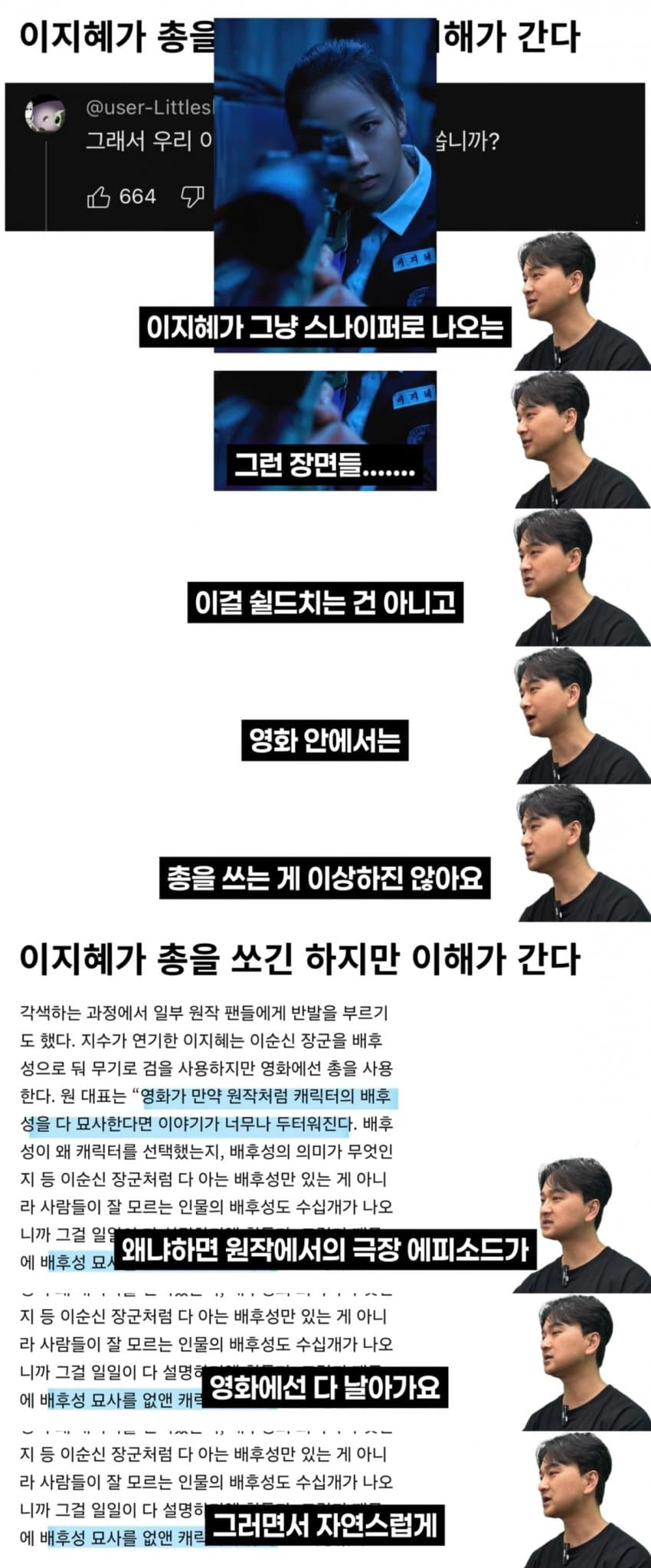 이지혜 캐릭터가 영화 안에서 총을 쓰는게 이상하진 않다고 함   원작 에피가 날아가서 이순신 장군님이 배후성이라는 부분 자체가 안나온다고 함   (오늘 뜬 감독 피셜 이지혜 분량은 약 5분 정도)