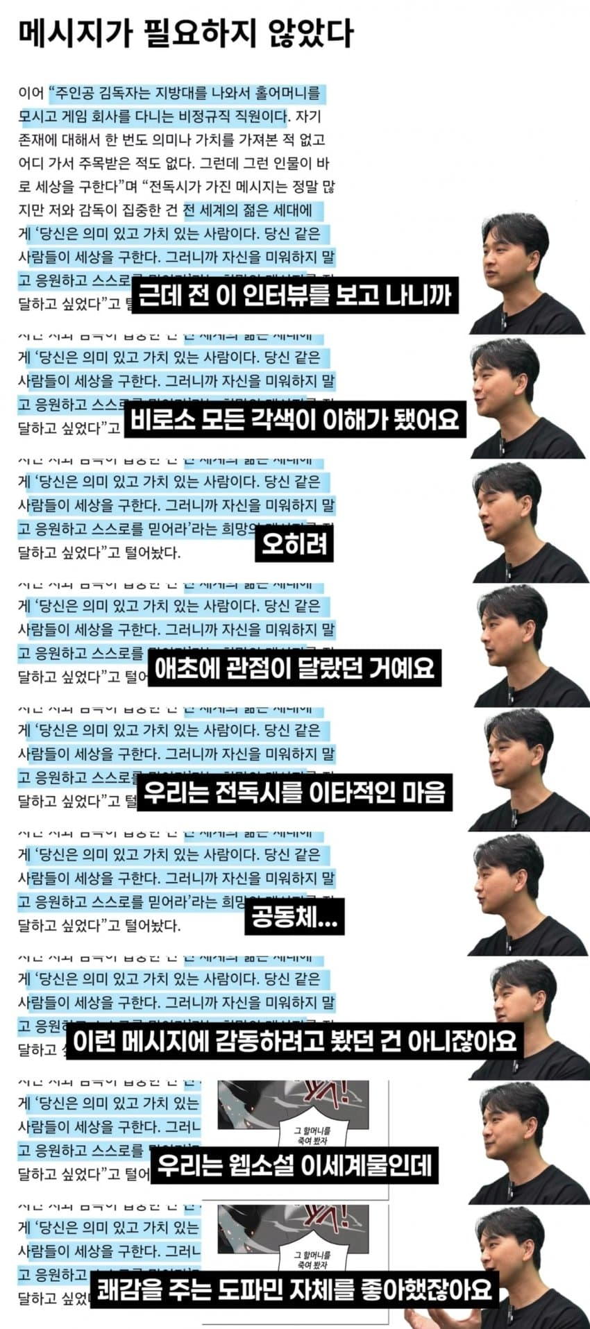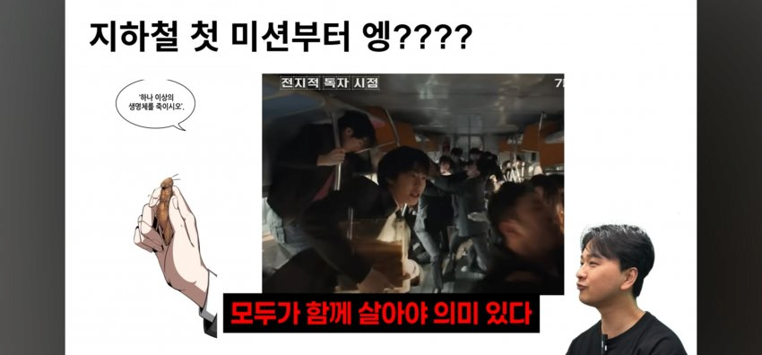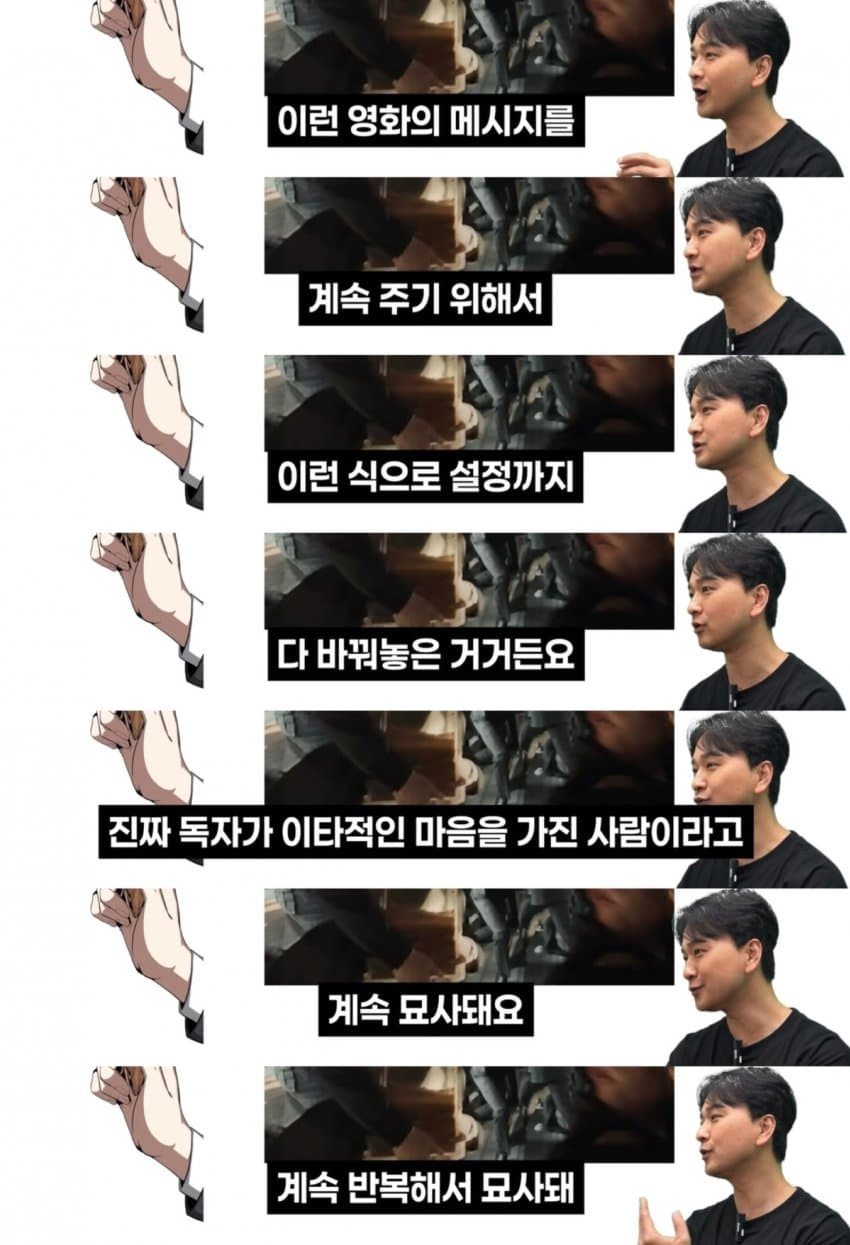 그렇다고 원작 안본 사람들도 재밌게 볼 수 있는 지에 대해서도 이야기 했는데 이것도 좀 애매하다고, 아니라고 단정할 수 없다고 함   전독시 자체가 도입부에 몰입하기까지 허들이 있는데   내용도 그냥 평범한, 교훈 있는, CG 많은 판타지 액션 영화로 나와서   개인적으로는 게임 같기도 해서 아쉽지만 회의적이라고 하심   그외 영화가 담은 메세지 관련 유튜버 생각
