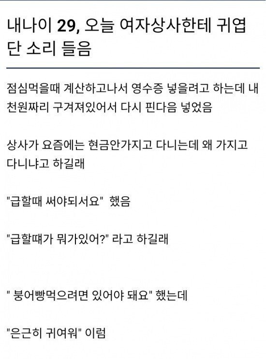 여자 상사한테 귀엽단 소리 들음 소밀면 0 186 0 2시간전 link URL 복사: https://humorpick.com/bbs/board.php?bo_table=humor&wr_id=397530 붕어빵은 중요하다 0