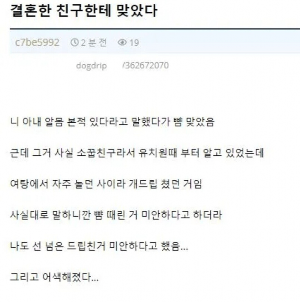 결혼한 친구한테 맞았다 김밤비 0 285 0 2시간전 link URL 복사: https://humorpick.com/bbs/board.php?bo_table=humor&wr_id=397560 0