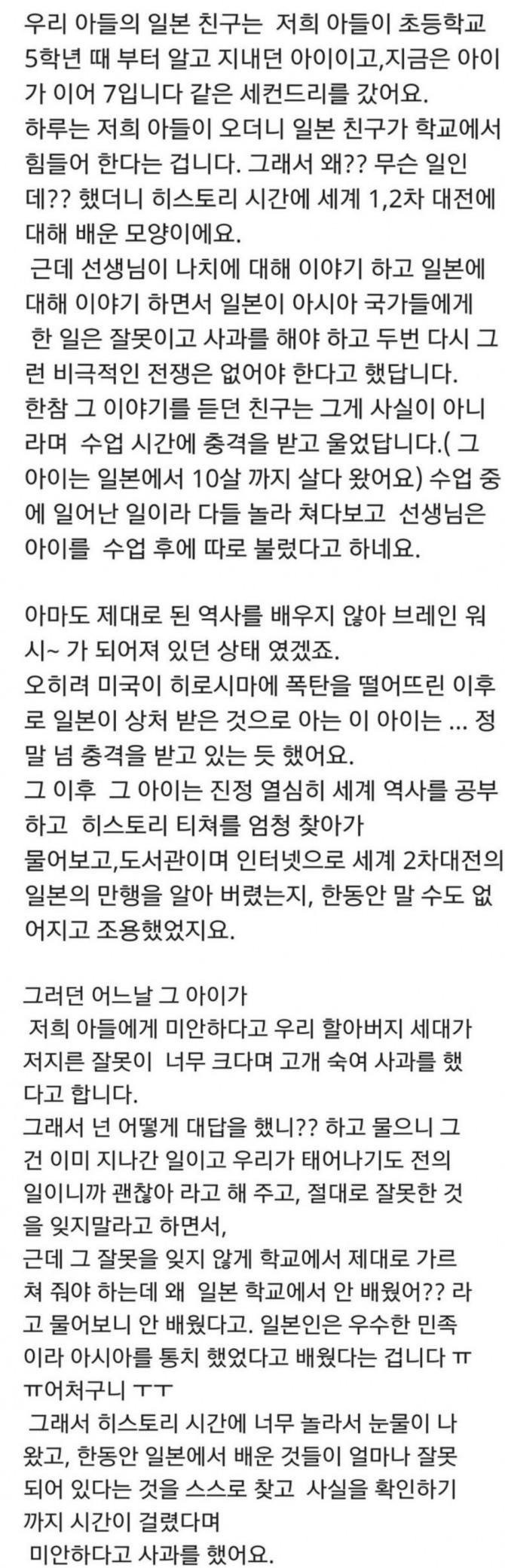 호주 교민의 자식과 일본인 친구 이야기 소밀면 0 182 0 2시간전 link URL 복사: https://humorpick.com/bbs/board.php?bo_table=humor&wr_id=397967 (일본은 학교에서 과거 일본의 침략 사실을 잘 안가르침.) 0