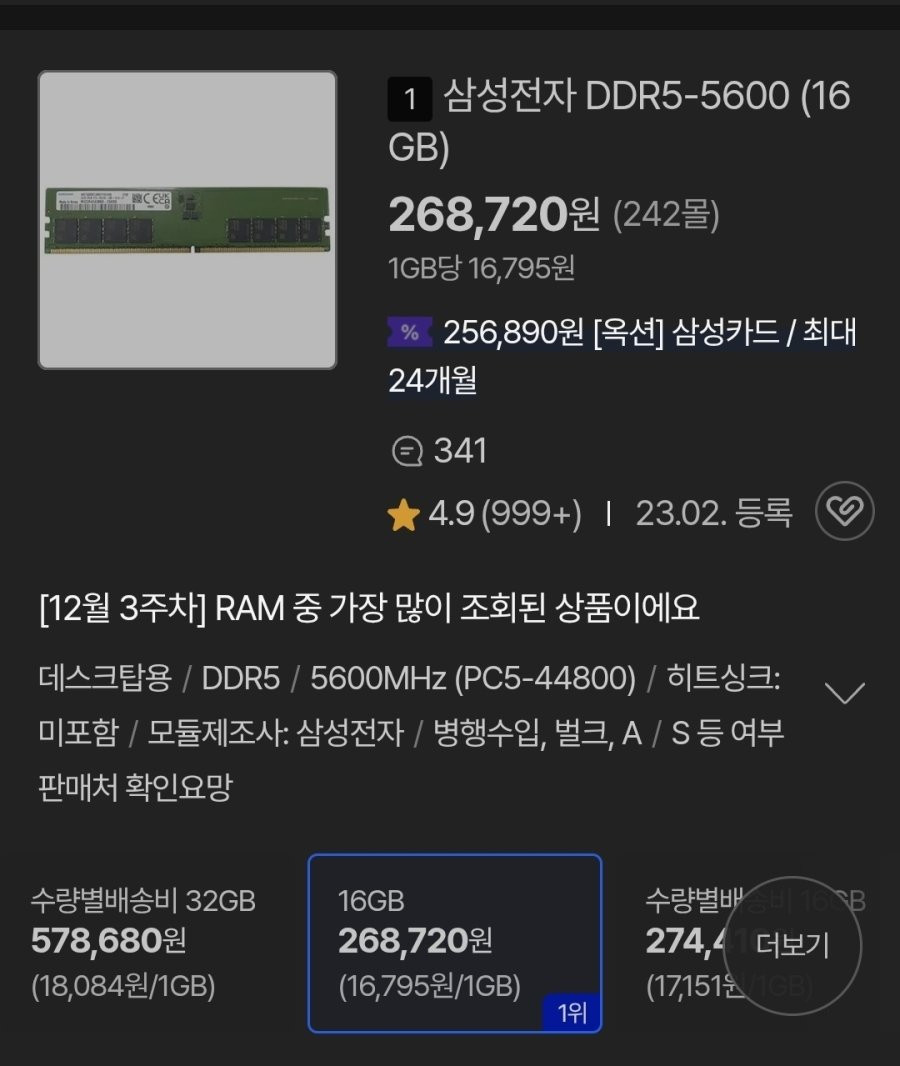 끝 없이 올라가는 컴퓨터 RAM 가격 근황 우라칸 0 180 0 12.22 23:17 link URL 복사: https://humorpick.com/bbs/board.php?bo_table=humor&wr_id=398009 32기가하면 60만원가까이 ㄷㄷ 0