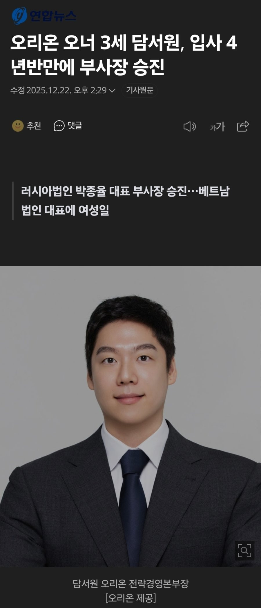 입사 4년 반만에 부사장 승진ㄷㄷ 아라셀리 0 235 0 2시간전 link URL 복사: https://humorpick.com/bbs/board.php?bo_table=humor&wr_id=398159 오리온 오너 3세 담서원, 입사 4년반만에 부사장 승진 | 연합뉴스 3세가 실력 0