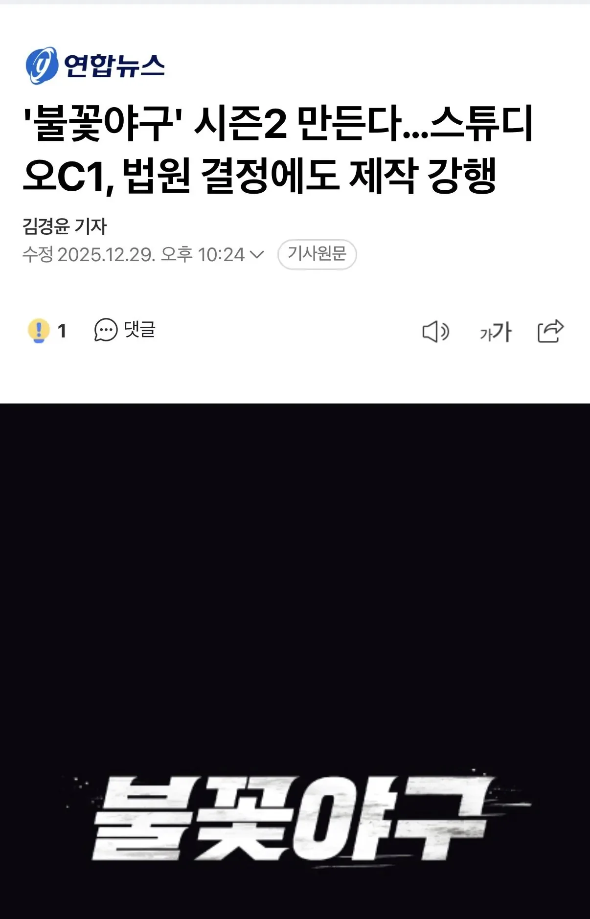 불꽃야구 시즌2 나온다 법원 결정에도 제작 강행 버디버디 0 259 0 3시간전 link URL 복사: https://humorpick.com/bbs/board.php?bo_table=humor&wr_id=398688 '불꽃야구' 시즌2 만든다…스튜디오C1, 법원 결정에도 제작 강행 JTBC와 야구 예능 프로그램 저작권을 놓고 갈등을 빚던 제작사 스튜디오C1이 '불꽃야구'의 후속 시즌 제작을 결정했다. 스튜디오C1은 29일 공식 유튜브 계정을 통해 "'불꽃야구' 시즌2를 하겠다"고 밝혔다. 지난 https://n.news.naver.com/article/001/0015819370?sid=103 0