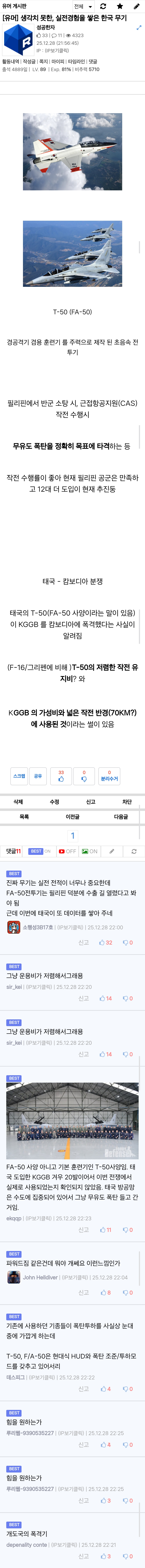 생각치 못한, 실전경험을 쌓은 한국 무기 오크대장 0 277 0 2시간전 link URL 복사: https://humorpick.com/bbs/board.php?bo_table=humor&wr_id=398781 * T-50의 기본 용도는 초보 파일럿 교육을 위한 훈련용 기체다 0