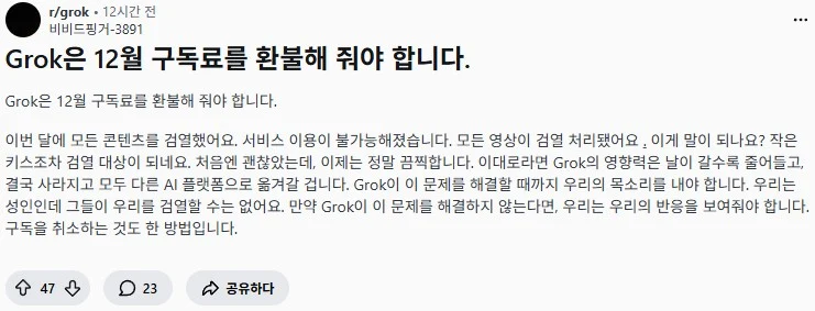 일론 머스크의 ai 그록 근황 우라칸 0 316 0 2시간전 link URL 복사: https://humorpick.com/bbs/board.php?bo_table=humor&wr_id=398885 검열이 이제 너무 심해져서 그록을 원하는대로 쓰려고 결제한 사람들이 사기라고 말하는 중 0