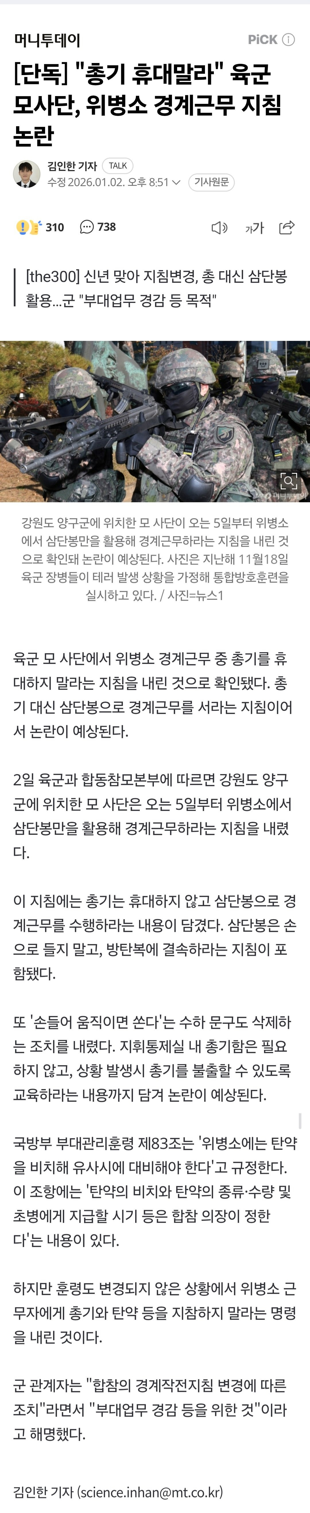 [단독] "총기 휴대말라" 육군 모사단, 위병소 경계근무 지침 논란. 아라셀리 0 341 0 01.04 12:34 link URL 복사: https://humorpick.com/bbs/board.php?bo_table=humor&wr_id=399013 움직이면 팬다 0