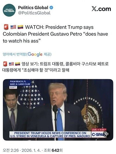 트럼프, 콜롬비아 대통령에게 경고 아기물티슈 0 278 0 01.05 15:17 link URL 복사: https://humorpick.com/bbs/board.php?bo_table=humor&wr_id=399120 ㄷㄷ 0