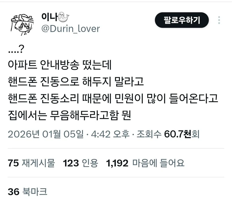 미쳐버린 아파트 안내방송 오크대장 0 412 0 01.07 15:17 link URL 복사: https://humorpick.com/bbs/board.php?bo_table=humor&wr_id=399222 아파트 방음이 어떻게 된 거냐? 0