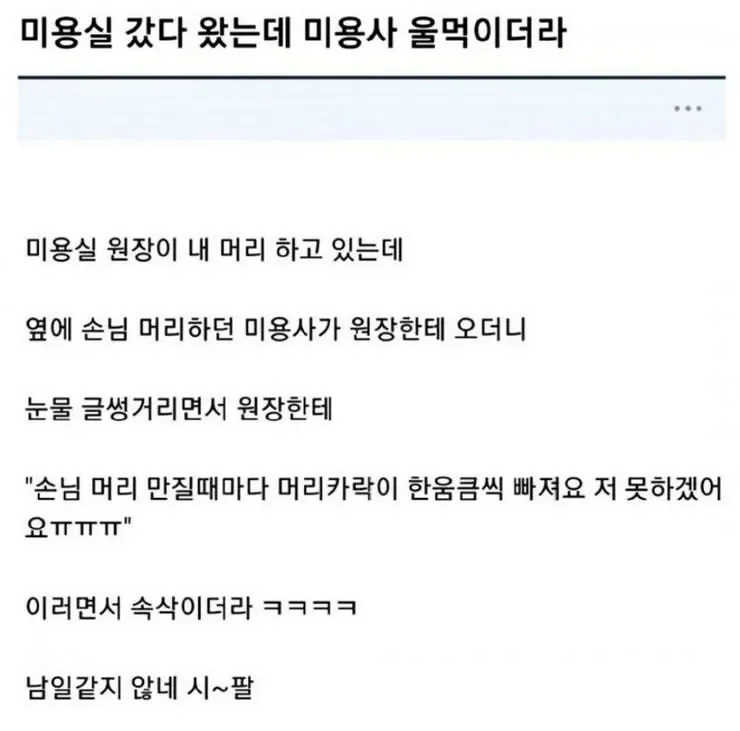 미용실 갔다 왔는데 미용사 울먹이더라 버디버디 0 285 0 2시간전 link URL 복사: https://humorpick.com/bbs/board.php?bo_table=humor&wr_id=399691 0
