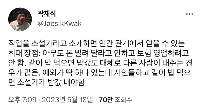 유명하지 않은 소설가가 밥을 얻어먹는 방법 우라칸 0 51 0 2시간전 link URL 복사: https://humorpick.com/bbs/board.php?bo_table=humor&wr_id=400195 그냥 소설가한텐 밥을 사줘요 0