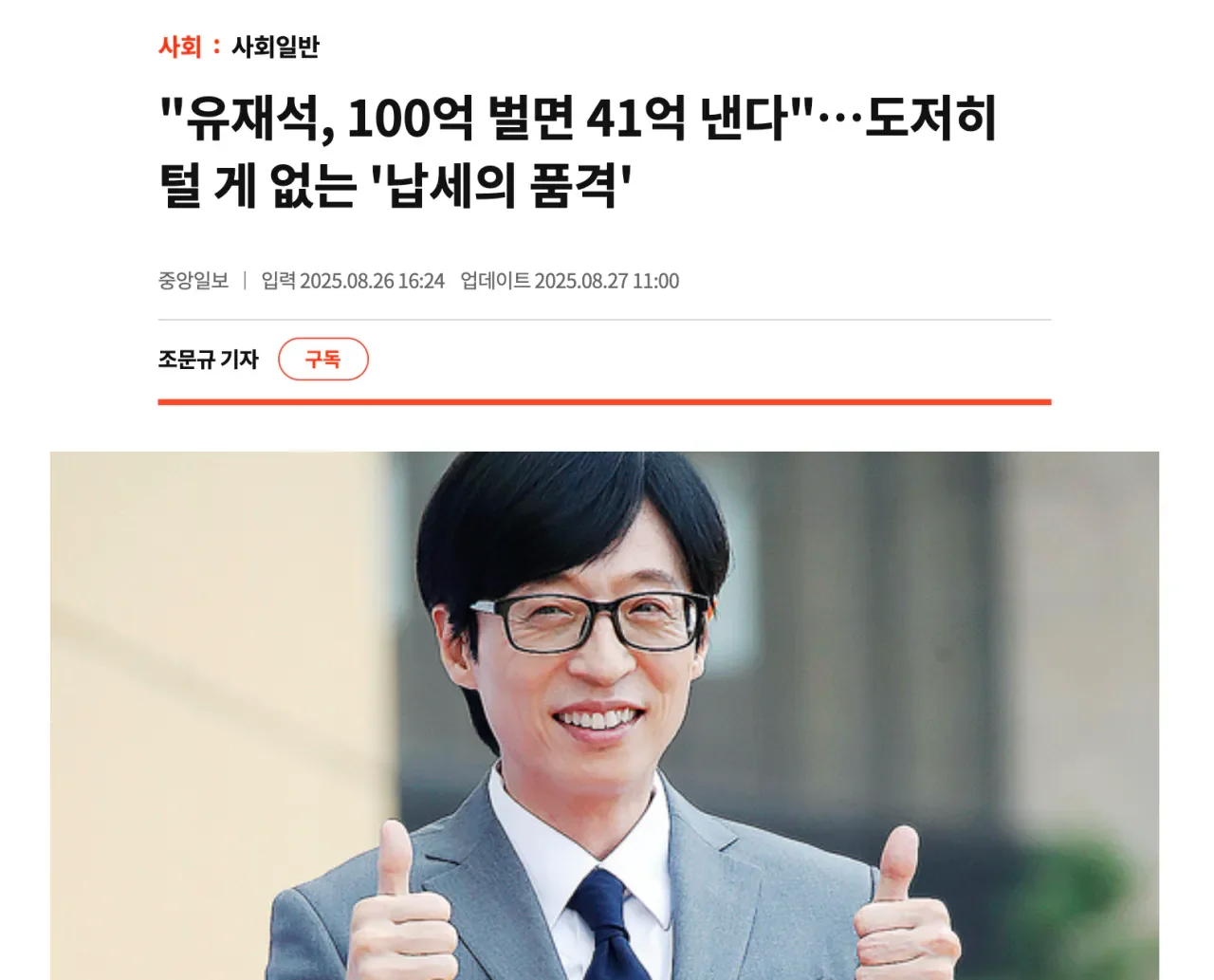 100억 벌면 41억 낸다".. 도저히 털 게 없는 '납세의 품격' 아기물티슈 0 199 0 2시간전 link URL 복사: https://humorpick.com/bbs/board.php?bo_table=humor&wr_id=400442 "유재석, 100억 벌면 41억 낸다"…도저히 털 게 없는 '납세의 품격' | 중앙일보 유재석은 지난해 6~7월 서울지방국세청 산하 강남세무서로부터 방송 출연료 수입 누락과 경비 처리 등과 관련된 고강도 세무조사를 받았지만 세금 신고 오류나 누락 등 어떠한 혐의점도 발견되지 않았다. 첫 번째는 세무사를 고용해 모든 수입과 지출 등을 장부에 기록한 뒤 이를… https://www.joongang.co.kr/article/25361813 0