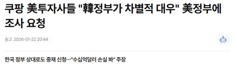 쿠팡 美투자사들 "韓정부가 차별적 대우" 美정부에 조사 요청 버디버디 0 222 0 2시간전 link URL 복사: https://humorpick.com/bbs/board.php?bo_table=humor&wr_id=400487 https://www.yna.co.kr/view/AKR20260122157900009?input=1195m 0