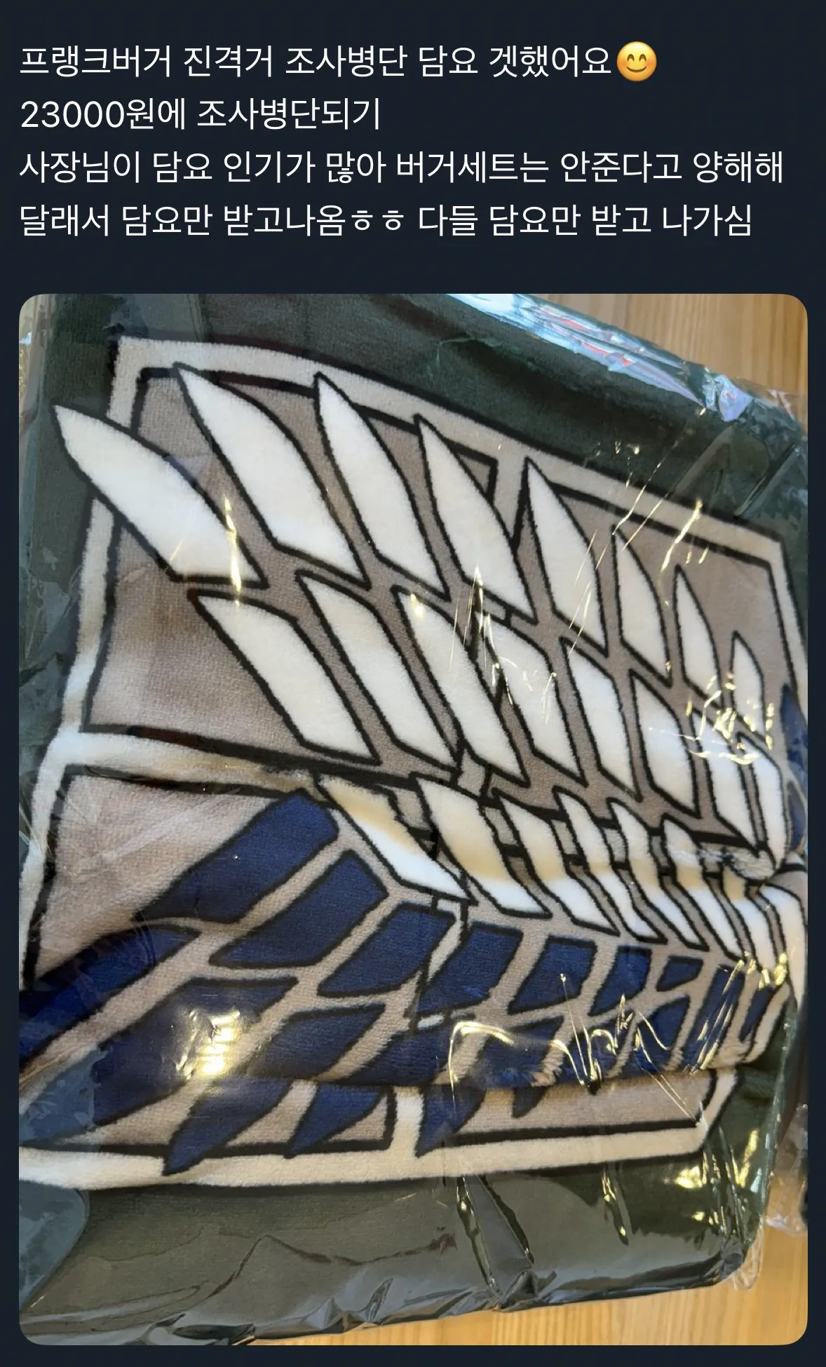 프랭크버거 콜라보한 진격거 근황 오크대장 0 88 0 2시간전 link URL 복사: https://humorpick.com/bbs/board.php?bo_table=humor&wr_id=400545 프랭크버거 콜라보한 진격거 근황 버거 빼고 이벤트상품 되팔이 ㄷㄷㄷ 점주 미쳤네여 0