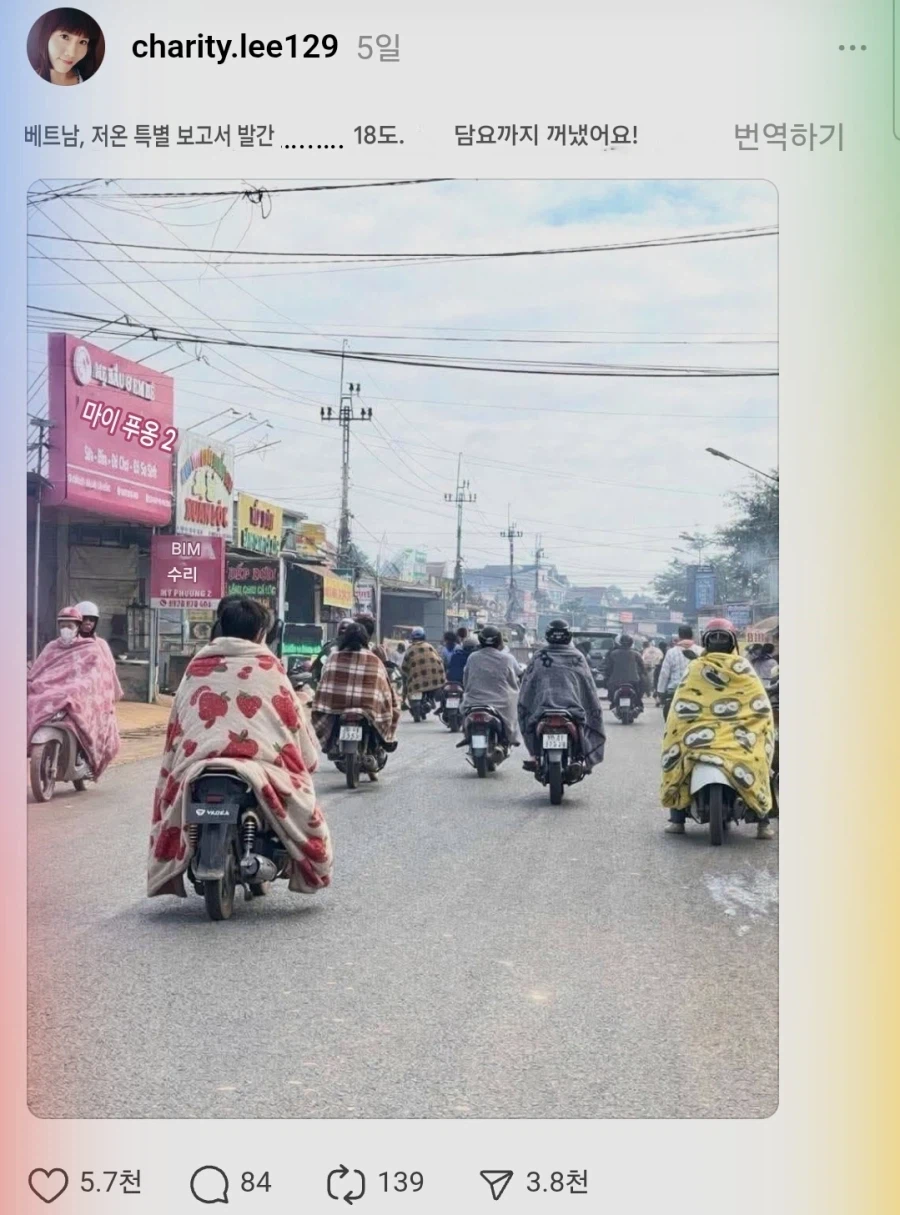 베트남에서 영상 18도란? 소밀면 0 286 0 1시간전 link URL 복사: https://humorpick.com/bbs/board.php?bo_table=humor&wr_id=400677 완전 추워서 담요꺼냄 0