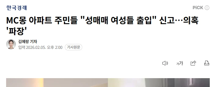파도 파도 끝이 없네... (mc 몽 기사) 푸른바다 0 56 0 02.07 22:51 link URL 복사: https://humorpick.com/bbs/board.php?bo_table=humor&wr_id=401838 얼마전에 불륜 기사도 뜬거같은데.....뭐 유흥업소가 모두 성매매 업소는 아니긴하지만서도.....집으로 출장? 을 부른것도 이상한데 ...멘탈이 엄청 신기해서 기사 일부 가지고 와봄 ㅎㅎ 0