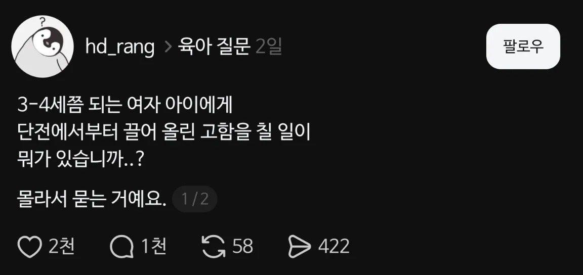 3~4세 여아에게 고함을 칠 일이 뭐가 있어? 픽시베이 0 275 0 2시간전 link URL 복사: https://humorpick.com/bbs/board.php?bo_table=humor&wr_id=403514 0