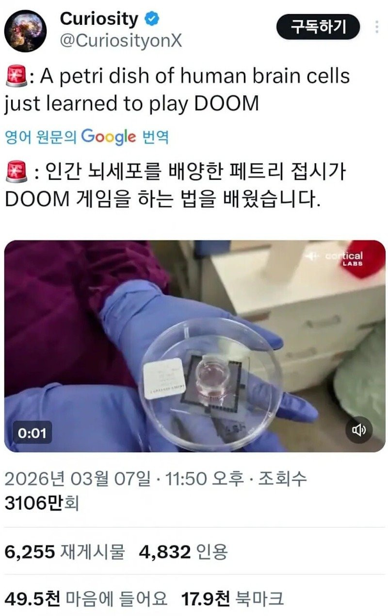 인공 배양된 뇌세포 충격적 근황.doom 김밤비 0 209 0 1시간전 link URL 복사: https://humorpick.com/bbs/board.php?bo_table=humor&wr_id=405101 이 문장이 보이면 video 태그를 지원 하지 않는 브라우저 입니다. 0