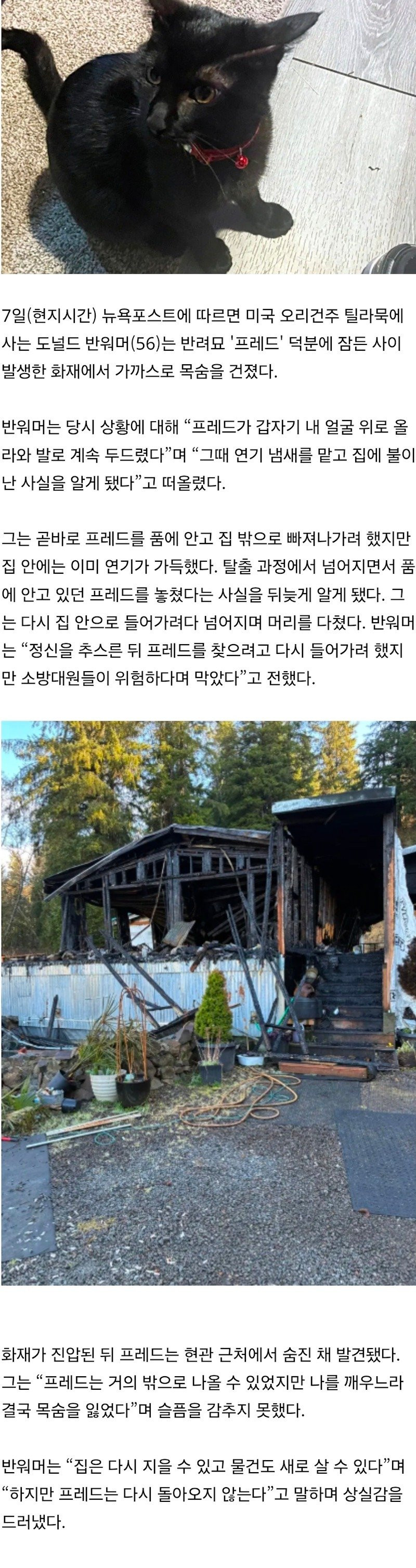 “얼굴 때려 깨웠다”… 불길 속 주인 살리고 숨진 반려묘 몽둥이 0 118 0 03.16 23:00 link URL 복사: https://humorpick.com/bbs/board.php?bo_table=humor&wr_id=405313 영어기사 일부 번역: 소방관들은 나중에 그에게 과열된 제습기가 화재의 원인일 가능성이 높다고 말했다. 밴워머는 경미한 화상을 입었지만 병원 치료를 거부했습니다. 0