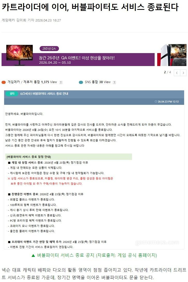 버블파이터 게임 서비스 17년 만에 섭종 아라셀리 0 227 0 1시간전 link URL 복사: https://humorpick.com/bbs/board.php?bo_table=humor&wr_id=407874 6월 중으로 서비스 종료 0