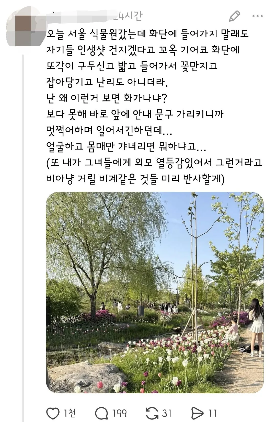 서울식물원 화단 논란.jpg 아기물티슈 0 207 0 2시간전 link URL 복사: https://humorpick.com/bbs/board.php?bo_table=humor&wr_id=407944 서울 식물원측에서 화단에 들어가지말라고경고문을 붙여놓았음에도 들어가서 꽃밟고 사진찍는 사람들이 많아서 논란.인스타에 서울식물원 검색하면 경고문 무시하고 들어가서 찍은 사진들 굉장히 많다고함. 0