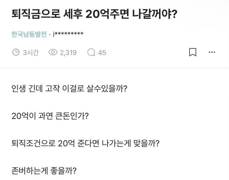 퇴직금으로 세후 20억 주면 나갈 거야? 픽시베이 0 271 0 1시간전 link URL 복사: https://humorpick.com/bbs/board.php?bo_table=humor&wr_id=408012 0