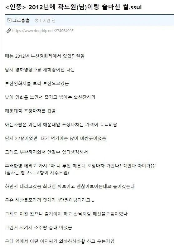 2012년에 곽도원이랑 술마신 썰 라카라카 0 711 0 10.10 00:00 link URL 복사: https://humorpick.com/bbs/board.php?bo_table=ssul&wr_id=933 이 문장이 보이면 video 태그를 지원 하지 않는 브라우저 입니다. 0
