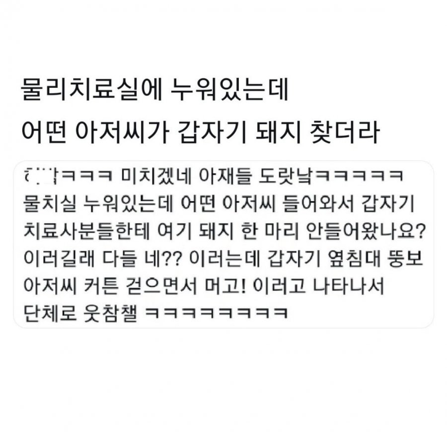 병원에 돼지 들어온 썰 아기물티슈 0 358 0 01.09 16:00 link URL 복사: https://humorpick.com/bbs/board.php?bo_table=ssul&wr_id=1481 0