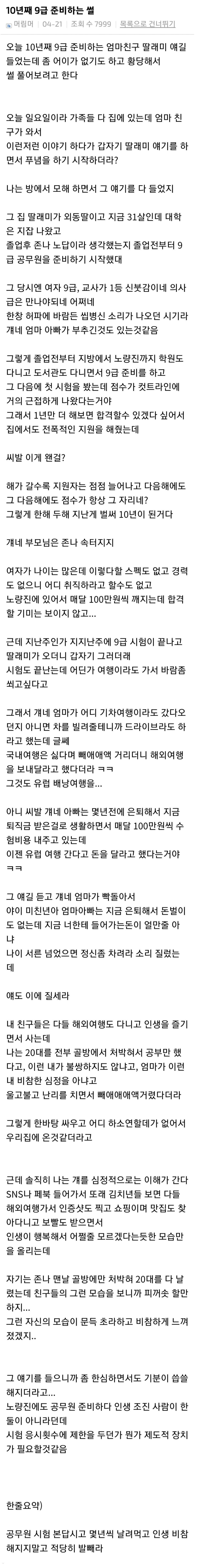 10년째 9급 공무원 시험 준비하는 사람 썰 아기물티슈 0 292 0 2시간전 link URL 복사: https://humorpick.com/bbs/board.php?bo_table=ssul&wr_id=1529 . 0