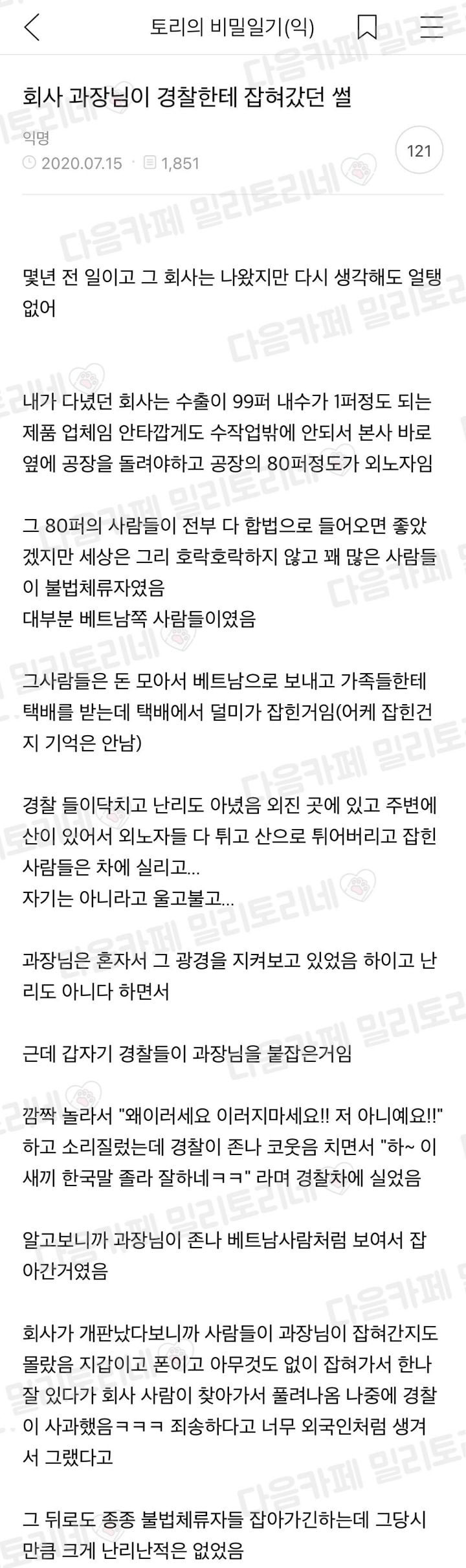 회사 과장님이 경찰한테 잡혀갔던 썰 아기물티슈 0 249 0 2시간전 link URL 복사: https://humorpick.com/bbs/board.php?bo_table=ssul&wr_id=1576 0