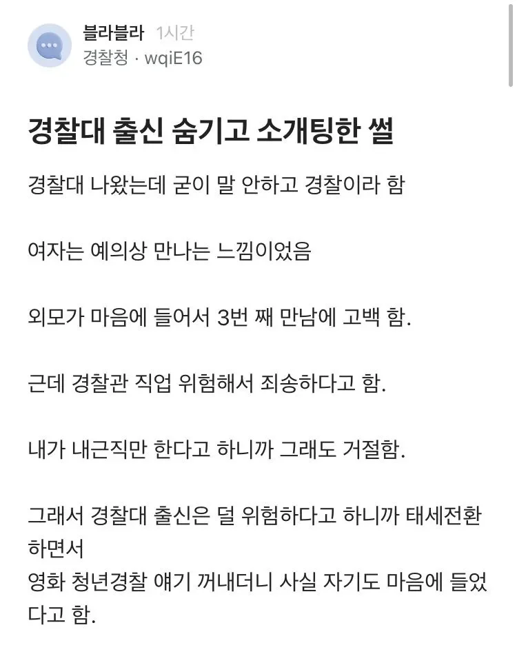 경찰대 출신 숨기고 소개팅 한 썰 버디버디 0 203 0 2시간전 link URL 복사: https://humorpick.com/bbs/board.php?bo_table=ssul&wr_id=1898 0