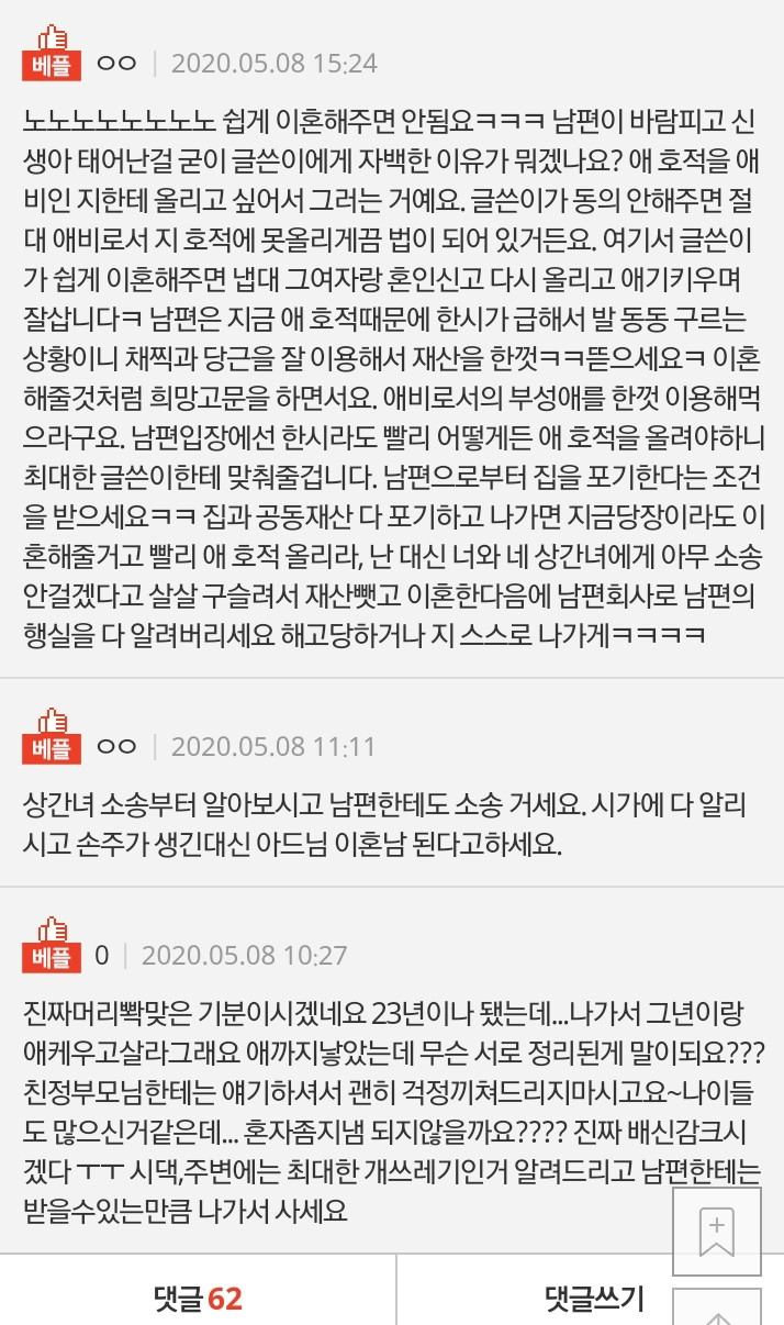 그 뒤 말이 더 가관이에요. 여자랑은 관계 다 정리했는데 본인은 자꾸 애가 눈에 밟힌다네요. 저희 둘 사이에 아기가 없으니까 남편이 입양 이야기를 가끔 꺼내기는 했어요.