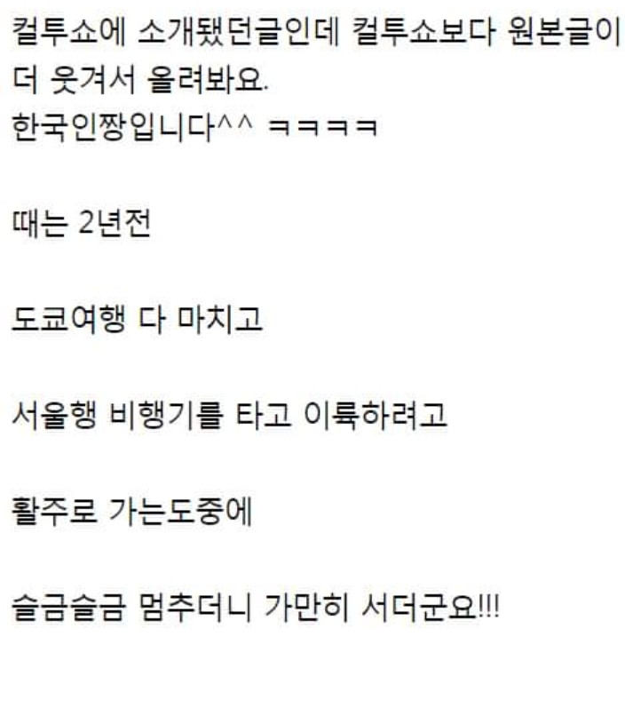 빨리빨리의 민족 자랑스러운 한국인 썰 (컬투쇼 사연) 픽시베이 0 1151 0 05.11 16:00 link URL 복사: https://humorpick.com/bbs/board.php?bo_table=ssul&wr_id=40 컬투쇼에 소개됐던 글인데 완전 대박이네요 ㅋㅋㅋㅋㅋㅋㅋㅋㅋㅋㅋㅋㅋㅋㅋㅋ 0